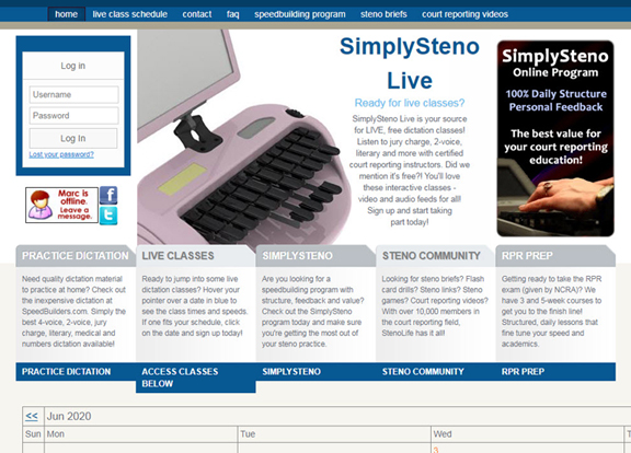 SimplySteno Live – We offer between 8-10 hours a week of live dictation. Attendance is voluntary, but we highly recommend you show up and share some quality speedbuilding time with your fellow students. Speeds, days, and times change each week to allow students from all across the country to attend at least a few classes each week. Classes are recorded and placed in the Video Library for later viewing. Included as part of the SimplySteno program.