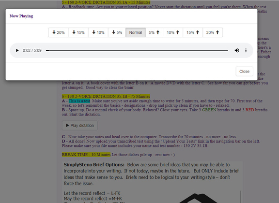 Daily Lessons – The core of SimplySteno are the daily lesson plans. You log in each day, go to your lessons, and it tells you exactly what to do. You have 5 lessons per week, with each lesson being about 3.5 hours long. You DO NOT pick your own material. You DO NOT decide what to practice each day. We’ve planned it out for you down to the second. If you were a 100 wpm student, for example, in a typical day you would hear dictations from 80 to 120 wpm – different combination of jury charge, literary, 2-voice, congressional, names and numbers, medical and more. Each day is different. Your job is to sit in the chair – we’ve done the rest!